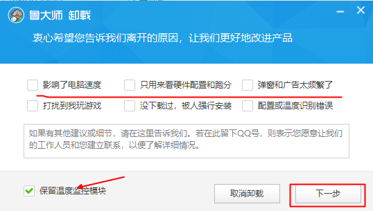 5.这里你随便选择一个原因;并且把保留温度监控模块取消勾选,如果你要可以不理他?