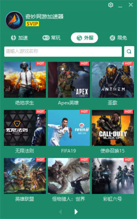 现在的热门游戏都是支持的,我最近一直都是开奇妙加速吃鸡的,加速还蛮快的,一点都不卡的。支持的游戏挺多,之前看斗鱼直播,看到主播在用推荐的,就去试了试,良心推荐,效果确实不错。