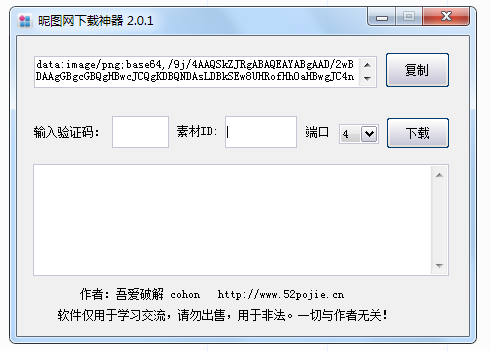昵图网素材破解工具无需登录!用户只要复制图片素材下载地址,就可以获得免费的验证码,输入验证码即可完成素材下载操作,简单便捷。一:支持自助下载,预览完成之后,对其进行下载。,三:自动保存功能,软件下载完毕后保存在软件根目录里面。