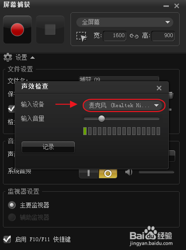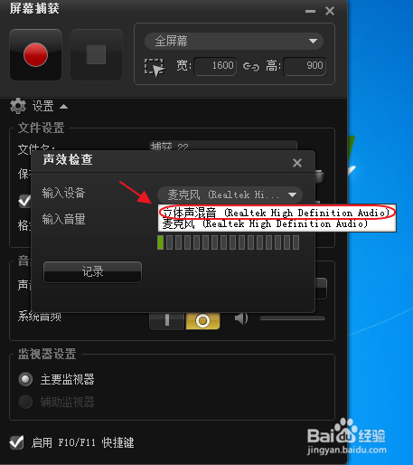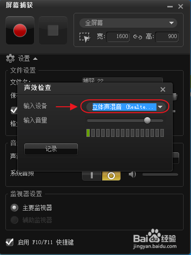 在;声效检查”界面,我们看到,在;输入设备”一栏右边显示的是;麦克风”选项,说明当前显示的声音输入设备是麦克风,而我们要的是视频声音,这就是为什么我们录不到视频声音的原因所在,如图中所示,对该选项进行点击,我们进行修改。