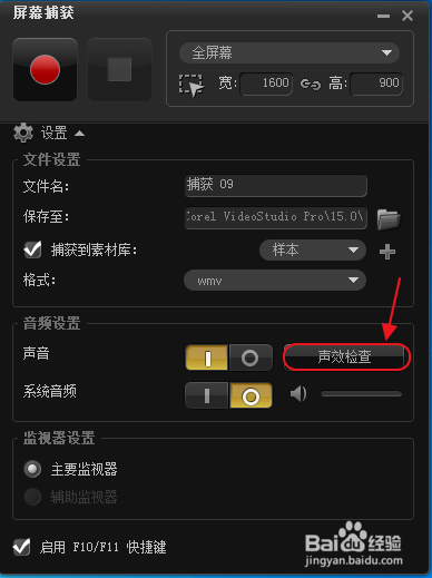 点击;设置”后,会出现下拉界面,在该界面中会详细列出屏幕捕获各个功能设置,主要包括;文件设置”、;音频设置”和;监视器设置”三个部分,在;音频设置”模块有个;声效检查”,点击它,打开;声效检查”选项。