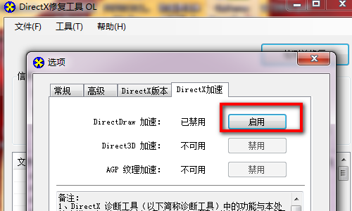 2、接着,在打开的选项弹出小窗口中点击DirectDraw加速后面的启用按钮。
