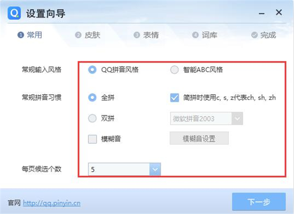 1、在安装完成界面勾选了;运行设置向导”选项,点击;完成”按钮后会自动开启QQ输入法设置向导窗口。在设置向导窗口的第一步,我们可以设置自己的输入风格、习惯和QQ拼音每页候选词的个数,选择完成后点击右下角的;下一步”。
