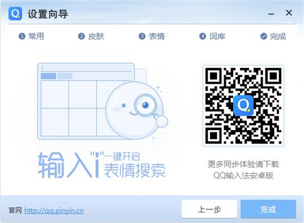 5、这样就全部设置完成了,向导提示在使用过程中输入;i”键可以开启表情搜索功能,确认后点击;完成”按钮即可。