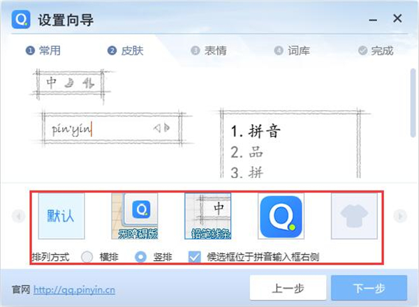 2、在第二步我们可以设置QQ拼音输入法的外观。选中QQ拼音皮肤和候选词排列方式后,可以在上方区域看到预览效果。设置完成后点击;下一步”。