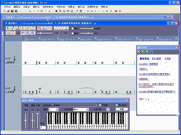 酷特音乐,是一款非常不错的音频制作软件!它可以帮助用户写歌和创作乐谱,软件功能实用,可以快速生成mid音乐,拥有自动伴奏,VST插件音色功能,总谱分谱制作,虚拟电子琴功能,适合简谱作曲或简谱打谱,如果你喜欢的话就来下载吧。自动伴奏:你可以将旋律输入软件后,通过自动伴奏功能,可以瞬间配置成不同风格的伴奏。可以很快的体验到您的作品配上伴奏后的效果,酷特音乐风官方版带有不同风格的伴奏模板,适用不不同用户的创作风格需求。,总谱分谱制作:Cutemidi软件具有强大的,总谱,分谱处理功能。用户可以根据需要,设置想要输出的分谱音轨,软件即可动态生成该分谱的乐谱,基本上不需要进行修改。