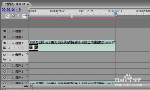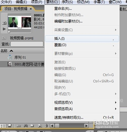 6.把鼠标放在视频上按住左键不放拖到时间线里,或是选择素材插入命令,将视频插入时间线中