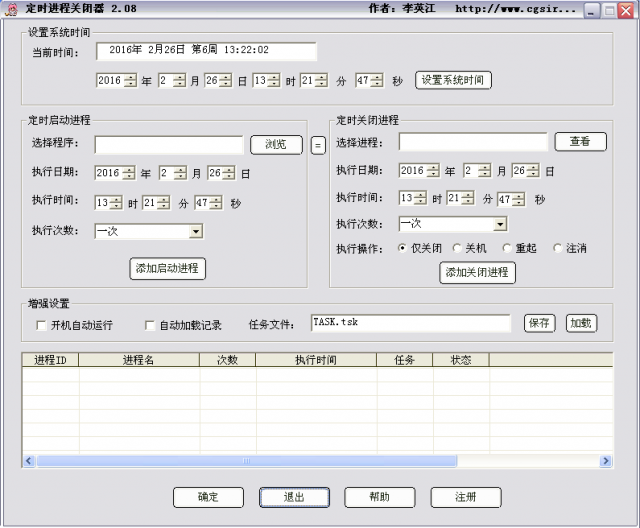 定时进程关闭器是一款简单的定时关闭电脑程序的软件,可以定时打开进程、执行文件,定时关闭进程,定时关机,系统启动时运行自动加载任务,保存任务,加载任务,调整系统时间,显示系统的所有进程等。