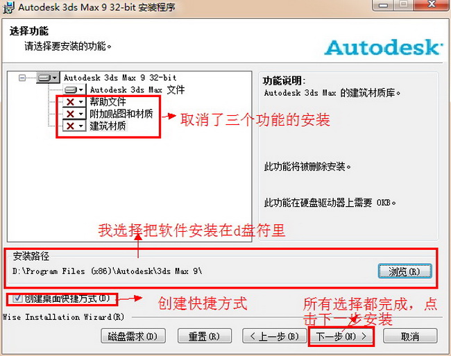在这个界面中我们看到了选择安装程序功能和安装3dmax9.0 32位 中文版路径;我们可以看到选择安装程序功能这里面有三个插件我们是可以选择不安装所以不选取。