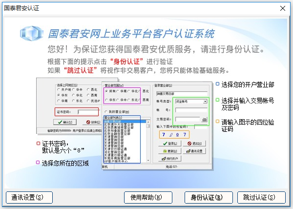 首次登录国泰君安大智慧会要求进行身份认证,身份认证可以把交易客户和非交易客户、高价值和普通客户予以区分,进行针对性服务,所以建议大家主动通过身份认证(非国泰君安网上交易客户可以跳过认证),认证方法如下: