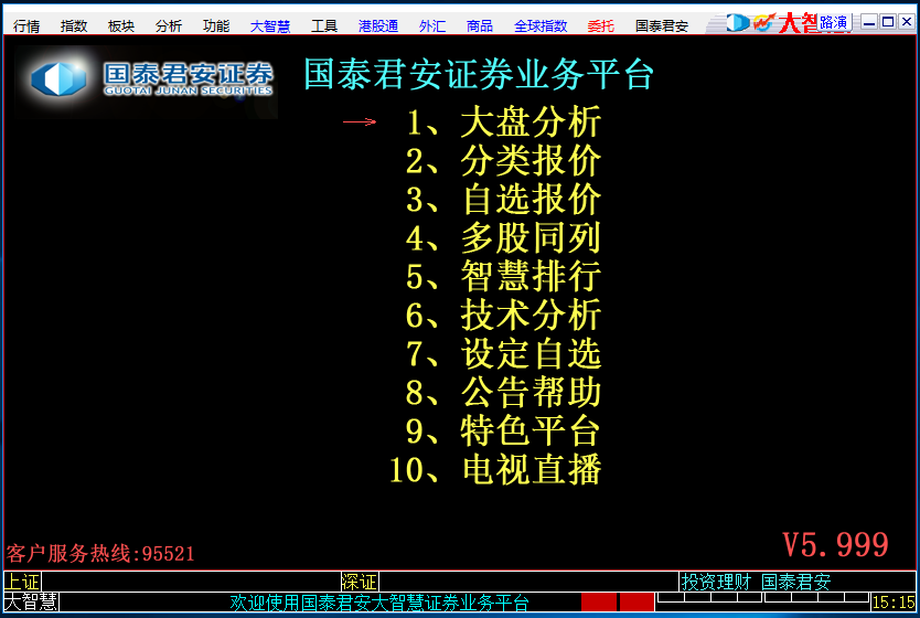 光行资源网提供的国泰君安证券大智慧V5.99官方版是一款实时提供证券市场行情和最新资讯,拥有完善的技术分析功能的软件。软件可以给用户带来大盘分析、分类报价、自选报价、多股同列、智慧排行、技术分析、设定自选、公告帮助、特色平台、电视直播十项功能。这款软件操作简单容易上手;安全快捷优化了登录机制和认证机制;资讯丰富拥有信息地雷、生命历程、全新F10、实时解盘等功能;稳定可靠让软件运行更稳定、更快速;国泰君安通过身份认证体系实现服务的针对性和个性化。软件只需要用户使用该客户端还需要本人带身份证和股东账户卡到营业部开通通讯密码功能,具有良好的保密性。