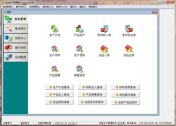 2、产成品出库管理)、查询统计(生产计划查询、材料往来查询、产品出入库查询、生产进度查询)、报表中心(原材料库存对帐、产成品库存对帐、生产能力分析、原材料流通分析);