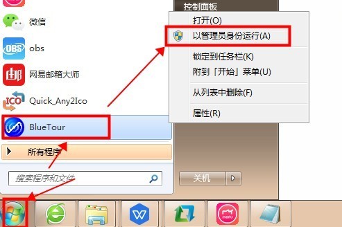 解决办法:点击确定关闭弹窗,打开电脑桌面左下角的【开始】,在【所有程序】列表中找到并使用鼠标右键以管理员身份运行【BlueTour.exe】即可