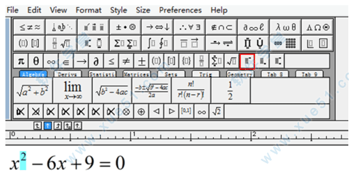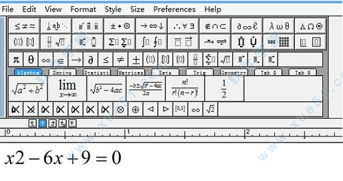 3、软件已经注册,安装完成后即可使用。 使用简介1、开启mathtype6.0破解版,进行公式编辑以编辑一个一元二次方程为例,在编辑区将编辑内容编辑完整
