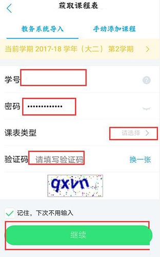5、这时选择“当前学期”,填上自己的学号和密码,在课表类型当中选择班级课表,填上验证码 ,并点击继续就可以自动导入