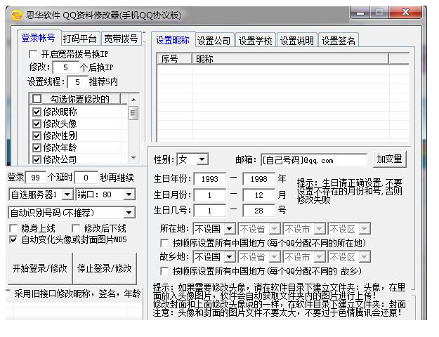 2.修改性别(男、女、随机);修改QQ年龄以及生日(支持设置指定范围的年/月/日)