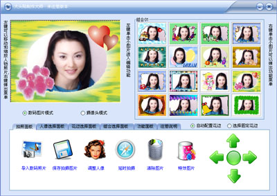 本软件使用非常简易方便,只要简单的点一下鼠标,就可以轻松制作出大头贴照片来,不需要额外任何学习。 本软件有配有上万种精美花边图案和几十中组合款式,可以任意选择花边和款式拍摄。而且只需一分钟就可拿到所拍摄的照片,照片可以保存为各种类型的图像文件,也可以打印输入在各类纸张上,或用电子邮件方式发送给好友。 拍好的照片可以根据您的需求进行图像编辑:照片底色、黑白处理、颜色翻转、怀旧效果、曝光效果、浮雕、柔化、锐化、水平镜像、垂直镜像、亮度调整、对比度调整、旋转180度、色调调整、波浪效果、褪色效果、图像描边、透明度调整、重新载图、添加文字、另存为等操作。 本软件还可以在拍摄时制作各种图片特效,如双胞胎图片制作、水中倒影图片制作、侧面倒影图片制作、四面倒影图片制作等等。