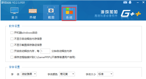 最后我们在游戏加加软件界面再点击“系统”选项,然后我们可以对软件进行设置,如下图所示,可以设置开机自启、释放内存以及字体等,按照自己的需要设置完成后就可以使用了。