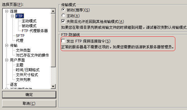 所谓防掉线或者说反空闲、闲置保护功能就是让计算机在空闲状态下每隔一段时间向FTP服务器发送一段特定信息,以便让FTP服务器知道自己还是活动的,从而并且FTP服务器断开对自己的连接。通过菜单【编辑】—>【设置】的FTP选项,我们就可以设置相关的参数。