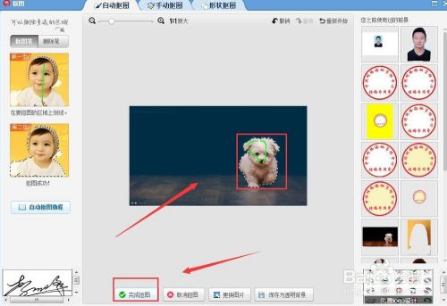 按住鼠标左键在抠图的区域上画线,如图所示,点击;完成抠图”。然后根据需要调整图片的位置和大小,点击确定,如图2所示: