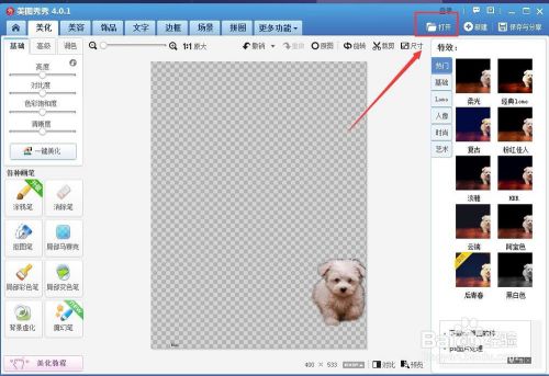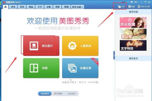 首先是打开美图秀秀软件,点击美化图片或者;打开”,选择要抠图的图片。如下图所示: