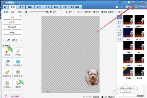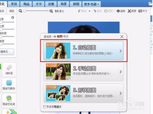 打开图片后,点击;美化”,在左侧的工具栏里选择;抠图笔”,在弹出的抠图样式中,选择;自动抠图”,如图所示: