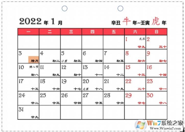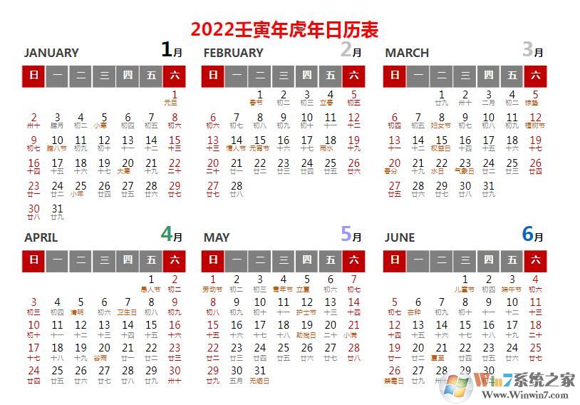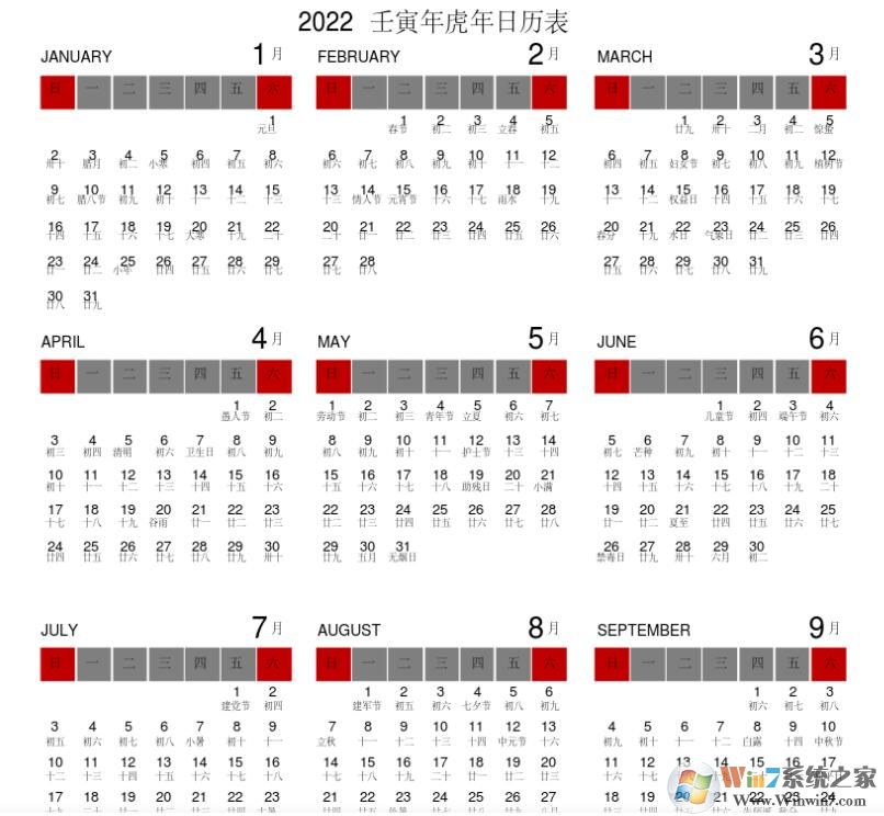 2022年日历全年表(带农历打印版)免费下载