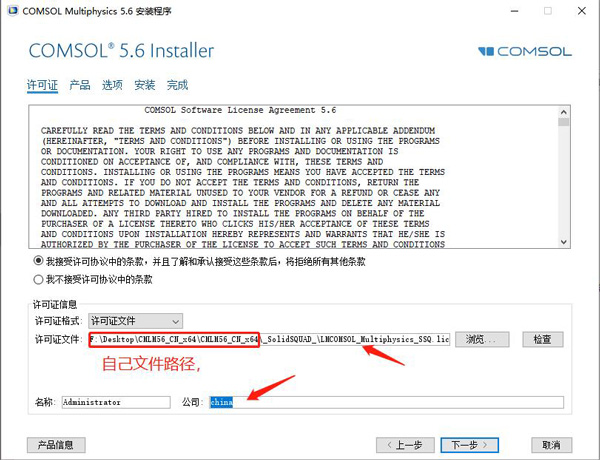 1、在许可证界面,许可证格式选择”许可证文件”,指向LMCOMSOL_Multiphysics_SSQ.lic许可证文件;