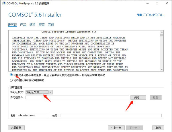 6、许可协议,先勾选“我接受许可协议中…”,然后将许可证格式栏修改为“许可证文件”,再点击【浏览】按钮加载许可证文件