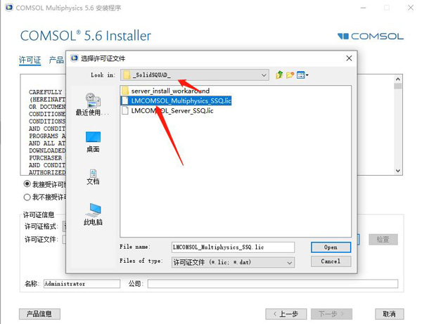 然后单击选中“LMCOMSOL_Multiphysics_SSQ、lic”文件,点击【打开】按钮