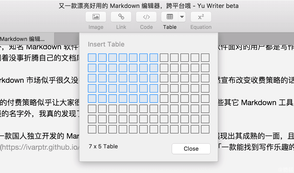 Yu Writer 对于图片、代码块以及表格的插入均提供了非常直观的处理方式,再也不需要记那么多的「代码」了——当然,也支持快捷键。