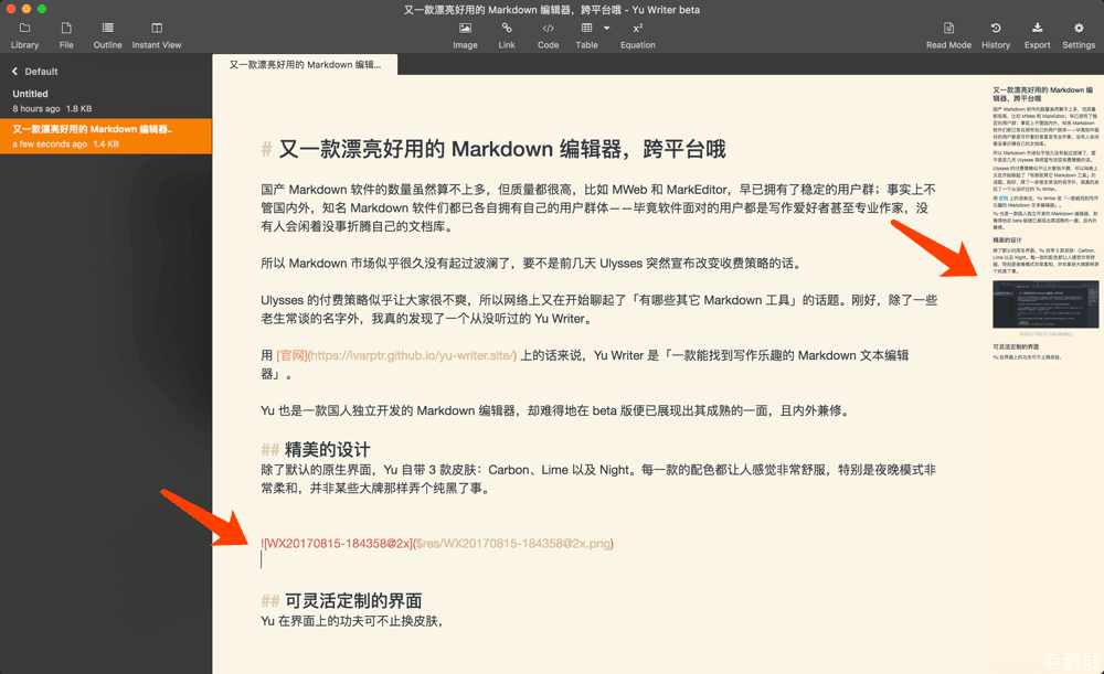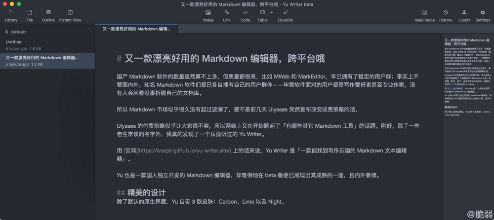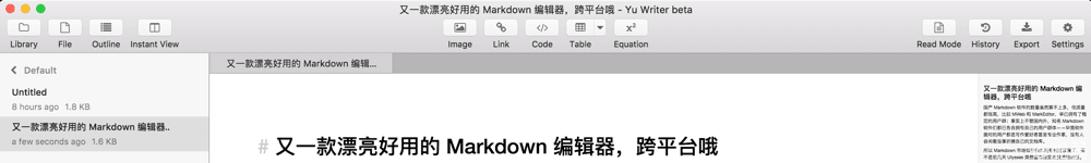 还有一个小惊喜,Yu Writer 把常见的右侧预览窗口缩成窄窄的一条,既能让用户将视觉焦点保持在写作区,又能随时瞄一眼效果,还不占地方。嫌小也可以自行拖拽放大,或按「Command ⌘ + R」全屏预览。