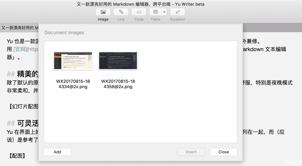 图片的插入也很高效,如下图所示,Yu Writer 内置图片管理器,用户可以一股脑把所有文章需要的图片都添加到进来,随着写作进程按需插入。图片管理器缩略图,这样我们就无需在 Finder/文件管理器和软件之间来回切换那么繁琐了。