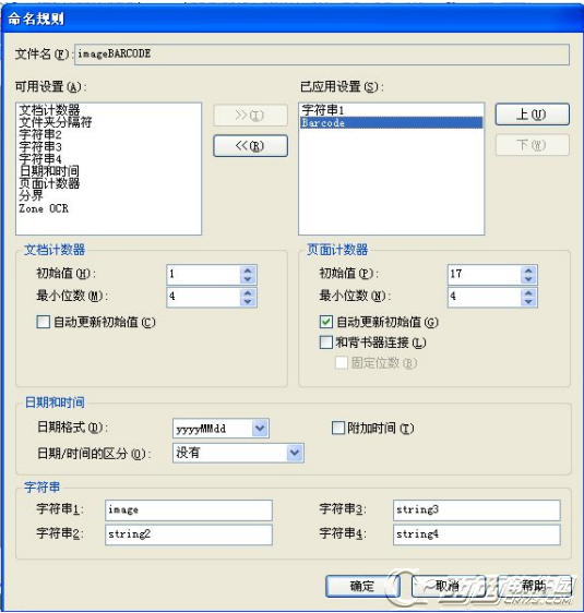 5.进入命名规则设置,将如图“可用设置”中的“Barcode”选中,点击中间的向右按钮, 使“Barcode”功能出现在“已应用设置”中