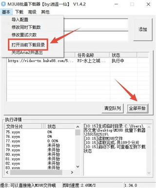 5、点击“全部开始”即可下载m3u8视频文件,点击基本-打开当前下载目录,即可看的下载的视频文。