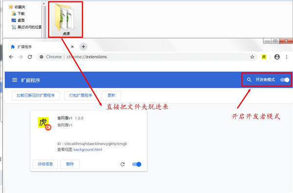 1、首先,解压趣哥提供的虎课网插件”,然后打开浏览器的“扩展程序”,这里以Chrome浏测览器为例,开启开发者模式”,直接把解压后的”虎课"文件夹拖动进浏览器。
