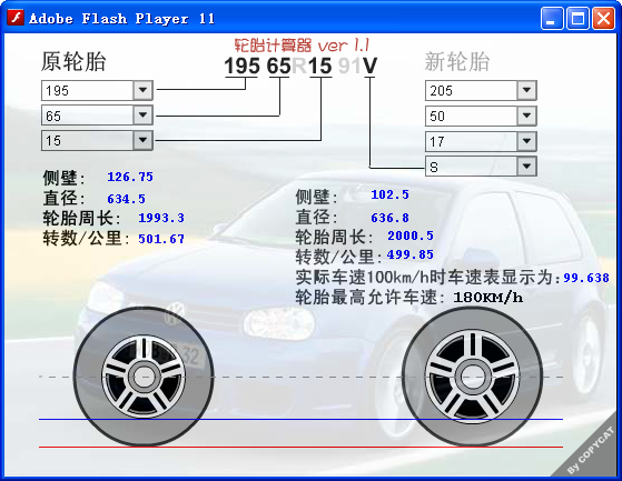 轮胎计算器是模拟汽车轮胎改造效果的软件,根据轮胎的各系数,汽车改造轮胎后,速度变化和速度表显示速度和真正速度的误差变化,软件制作flash,需要flash播放器的支持。- 下载地址(pc版)