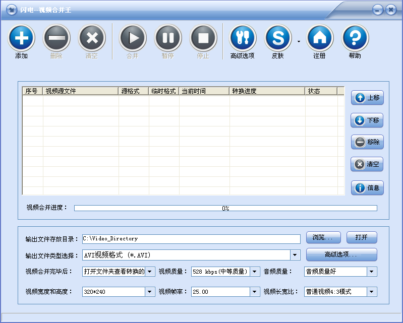 1、打开《闪电-视频合并王》,将出现下图所示的界面: