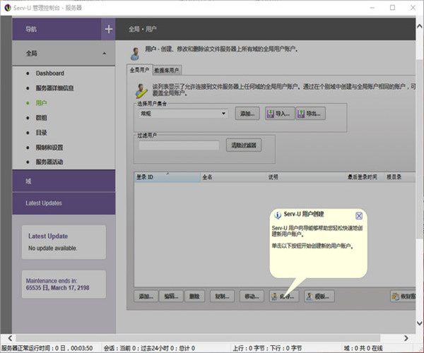 注意这里的设置是全局设置,在这里设置的最大上传下载速度还有用户数量都对下面的域或者用户的设置有限制作用,也就是说,即使在用户上设置的速度很大,实际也不会超过这里设置的值。