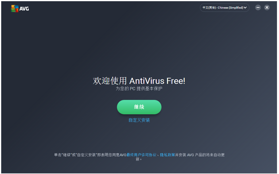 1、到本站下载安装AVG杀毒软件,解压压缩包,双击.exe文件,弹出界面,选择语言,点击【继续】或者【自定义安装】,