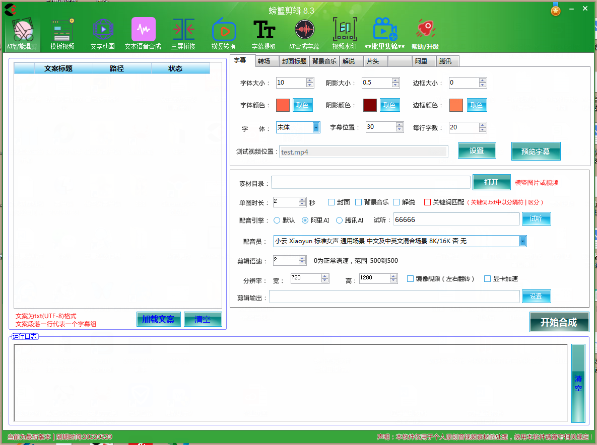 包括批量三屏拼接、横纵屏批量转换、字幕批量提取、AI字幕全自动合成、定制模板批量剪辑、文字动画剪辑、合成、重量、配音、字幕、水印、自动识别、自动生成开头等功能,给视频带来效果。- 下载地址(pc版)