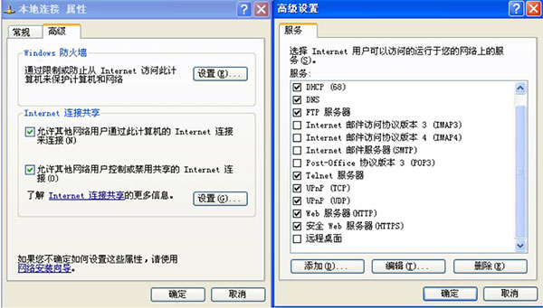 2、把本地连接,设置为共享internet连接,并设置把所有服务打开。