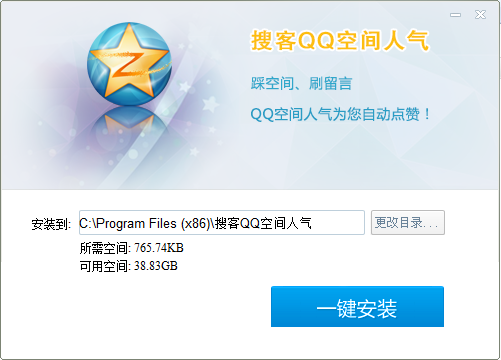1、下载搜客QQ空间人气,打开安装程序,默认软件安装位置,也可以点击浏览选择安装位置,开始一键安装