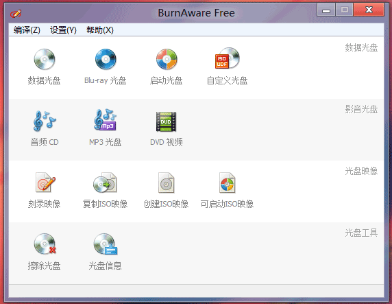 BurnAware Free电脑版是一款轻量级的,便捷实用的光盘刻录工具。支持CD/DVD/蓝光/HD-DVD光盘,同时适用于高级用户和初级用户。BurnAwareFree计算机版界面清爽清洁,操作简单,功能丰富,界面中各功能清晰,一目了然,使用方便,中文版语言界面,实测光线资源支持Windows8。