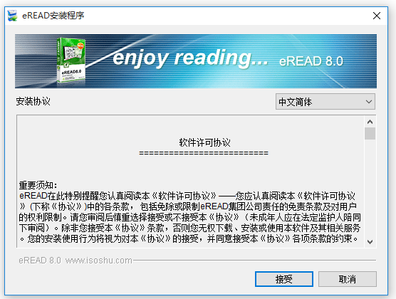 1、下载eREAD,解压压缩包,双击.exe文件,弹出界面,阅读协议,点击【接受】,