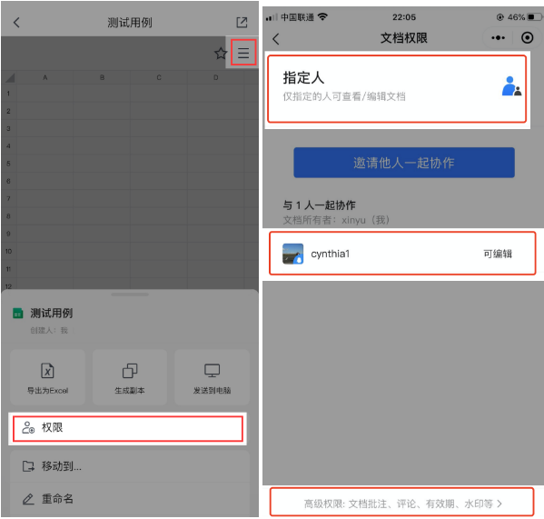 1、电脑端:进入自己创建的任意文档--点击界面右上角的「 权限 」图标--设置文档权限有效期、查看/编辑权限及相应成员即可。