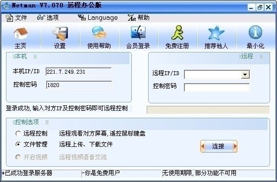 3、远程文件管理:上传、下载文件、远程修改、复印、投稿、运行文件,实现双方计算机的资源共享,用于远程办公室等。