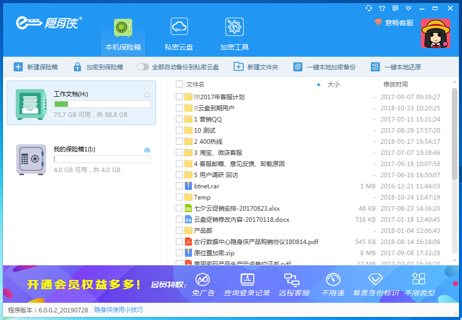 1、我的保险箱:在电脑、U盘、移动硬盘中划分一部分空间作为保密空间,存放到保险箱中的文件加密并隐藏!