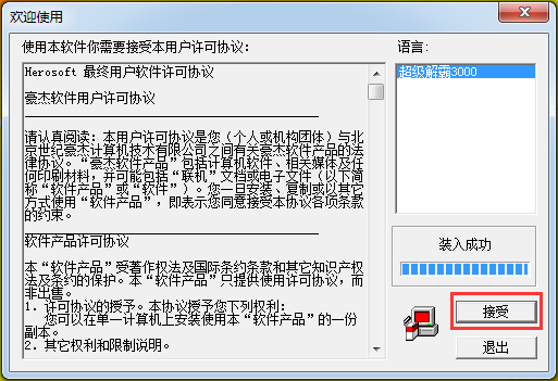 1、到本站下载安装超级解霸3000,打开安装程序,点击接受继续安装