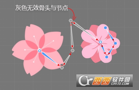 当骨头添加在无效区域时(比如说添加在图片以为的区域或骨头附着的图层不对),骨头跟固定点就会显示灰色,就代表此骨头跟固定点是无效的。